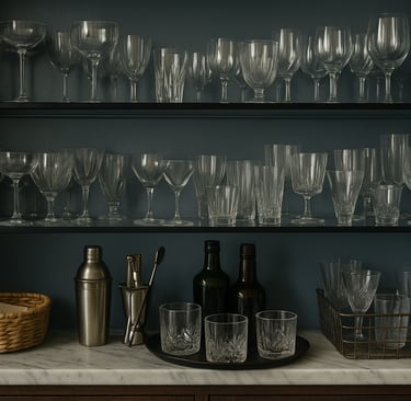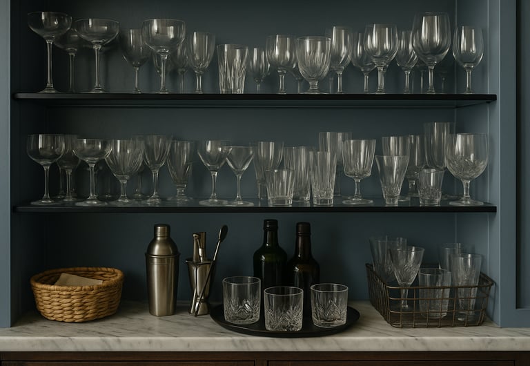 Focus on timeless glassware, one or two standout decanters, and a selection of well-loved bottles rather than quantity. What stands out here is the layering of multiple types of glassware: wine, coupe, martini, and tumblers are grouped loosely by form but not too rigidly, giving the bar a “lived-in” authenticity.